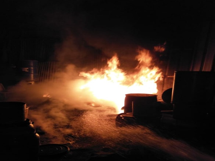 उदयपुर में गोदाम में लगी आग:शॉट सर्किट से प्लास्टिक ड्रम ने पकड़ी आग, काबू में करने के लिए दो घंटे चली मशक्कत